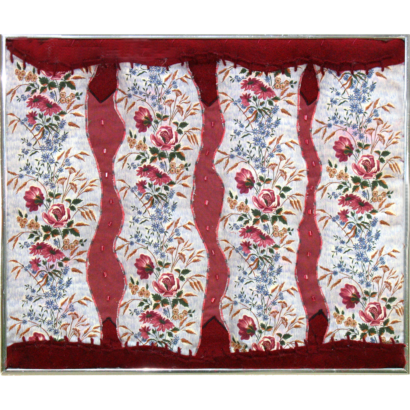 Wallpaper came about as a result of a challenge from my quilt guild, Marathon Quilters, to use mostly pieces from a bag of scraps. Most of them were very small, not even big enough to keep, from my point of view, but two of them, a solid red and a floral piece containing the same color, caught my eye and became this piece. I used some red felt to fill in at the top and bottom, with some yarn sewn on in a blanket stitch to bind it in.